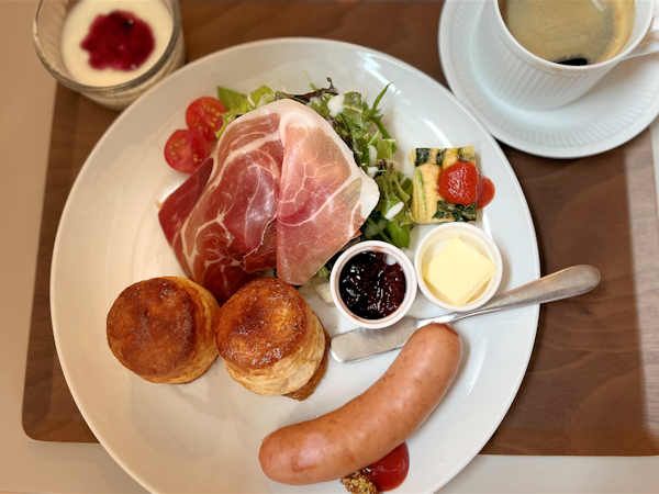 お目当てのモーニングメニューはNo.4(1,100円)。ここでしか食べられない自家製スコーンが、セットになっています。選べるドリンクはコーヒー(ホット/アイス)、紅茶(ホット/アイス)、牛乳、オレンジジュース、アップルジュース。 皿に並んでいるのは、大きなソーセージ、生ハムがのったサラダ、キッシュぽいオムレツ。温かいスコーンにはバターとジャムが添えられています。そのほかに、ヨーグルトが付きます。