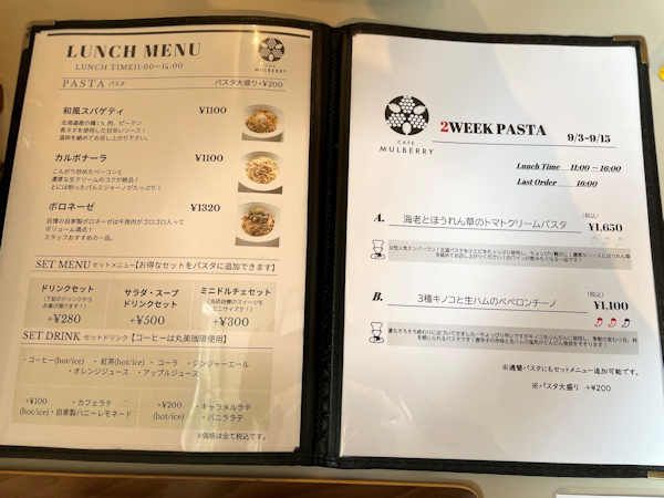 ランチは11時から。メニュー内容が、訪問後変更になったようで、今はレギュラー4種類と2週替わりの1種類。ドリンク付きは+280円、サラダ・スープ・ドリンク付きは+500円。ミニドルチェ付きは+300円。パスタの大盛は+200円。レギュラーは、和風、カルボナーラ、ボロネーゼの3種類に、週替わりで人気だったナポリタンが増えています。 ※メニューは、前週のモノです。