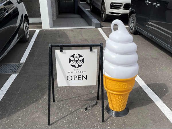 その桑園エリアにある2023年6月末にオープンした「CAFE MULBERRY」(カフェ マルベリー)さん。土日祝日の営業時間は8~17時。平日は朝9時からで、夜の営業はありません。4F建てのマンションの1Fにあります。車が駐まっていると、うっかり見過ごしそうなので、お店前の看板や幟が目印になります。