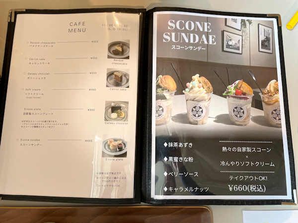 カフェメニューには、ケーキやソフトクリーム、4種類のスコーンサンデーがそろっています。こちらの注文は11時から。