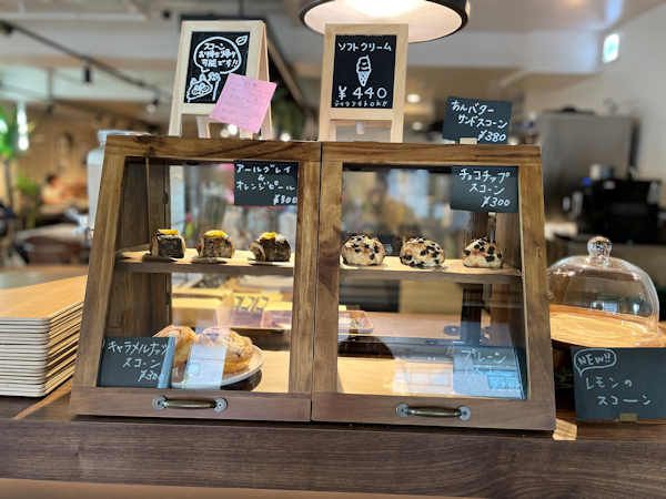 他のメニューのトーストは、桑園の人気パン屋「ココペライ」さんの角食を使用しています。こちらもぐっと惹かれたのですが、今回はスコーンを選択しました。セットのスコーンはプレーンでしたが、レジ横にいろいろなスコーンが置いてありました。テイクアウトもできるようです。