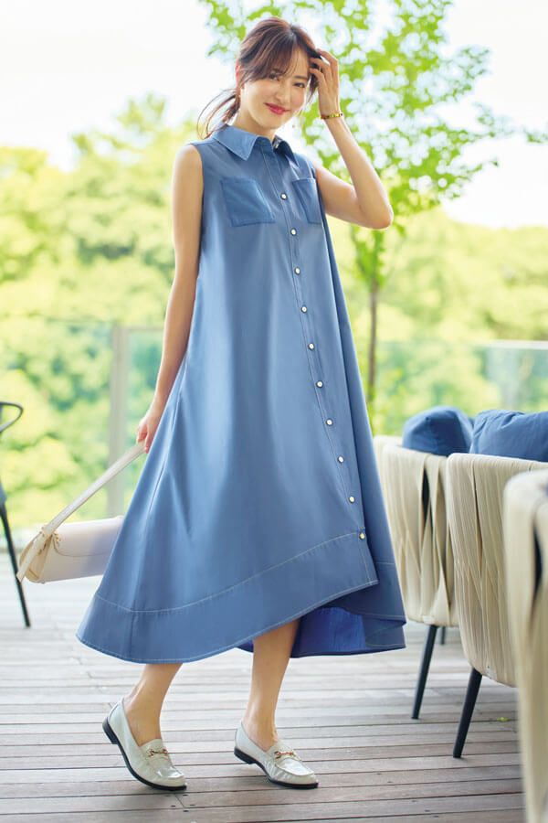 デコルテはしっかり隠しつつ、腕は大胆に見せられるノースリシャツワンピ。体のラインを拾わないふんわりシルエットも、ナチュラルタイプの味方です。