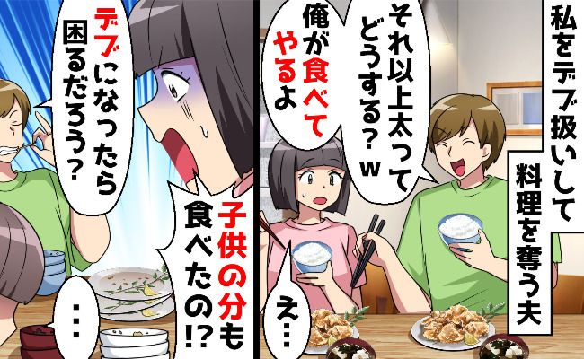 娘を出産し、産後思うように痩せられなかった私。最近は体重計にのるのもためらってしまいます。そんな私に夫は、呆れ顔。もちろん私にも痩せたい気持ちはあります。食べすぎないために、食事は少なめに盛り付けることにしました。しかしそんな私を見て夫は、「量を減らすだけで痩せられると思っているのか!?」と言い、私のお肉を奪ってぺろり。少しくらいは食べたかったと私が怒ると、逆に「感謝しろ」と言います。これは夫の言う通り、私が太らないためのやさしさなのでしょうか……?
