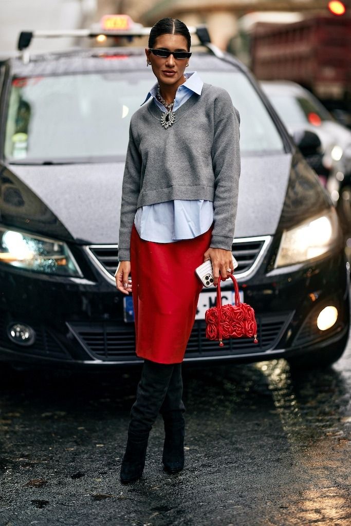 鮮烈な赤のミディスカートで華やかなオフィススタイルを披露してくれた彼女。トップスは、淡いブルーのシャツにグレーのニットをレイヤードすることで赤の強さを上手に中和していました。赤の主張が強いと感じた時はグレーを合わせることでコーデに洗練さが生まれます。コンパクトなバッグや大ぶりネックレスで華やかさがさらにアップ。