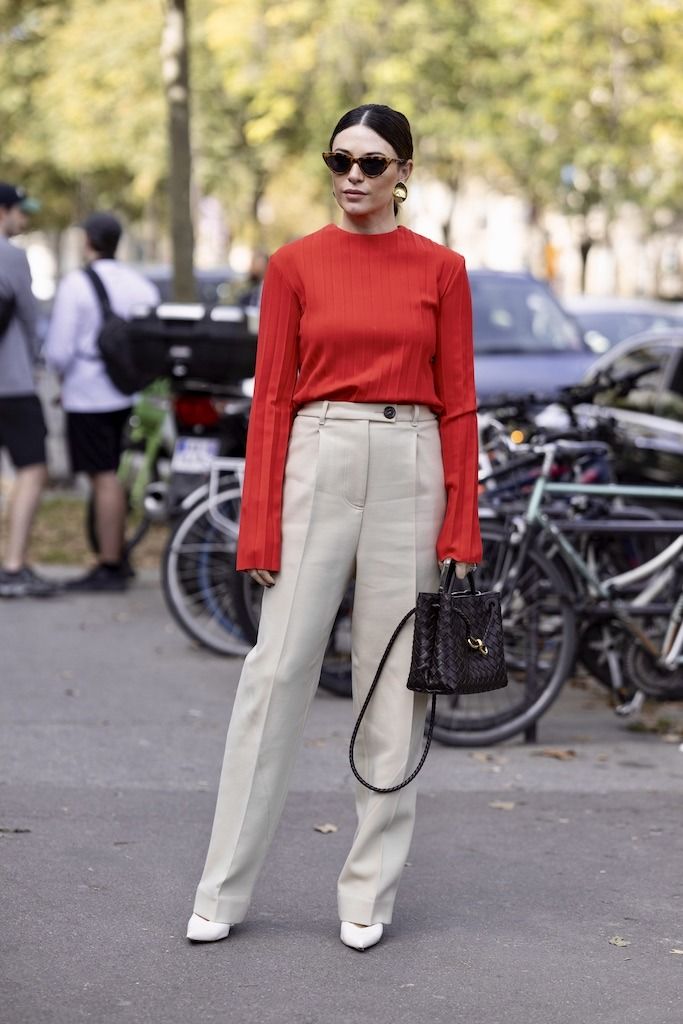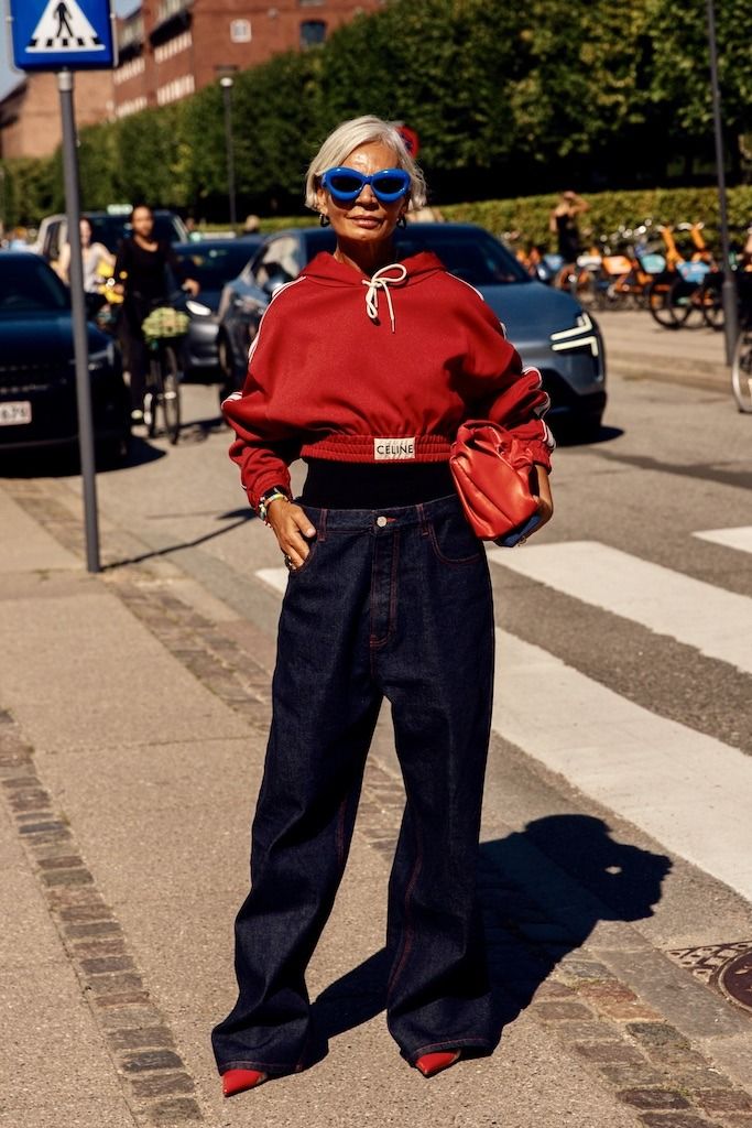 ポイントとなるレッドを随所に散りばめてモードカジュアルを堪能していたのは、インスタグランマとして知られるグレース・ガネム。主役にしたセリーヌのライン入りフーディは、彩度が低く大人っぽく着られるだけでなく、クロップド丈が今っぽさも添えてくれます。さらに、さりげなく施されたデニムの赤ステッチも彼女のこだわりが感じられます。レッド × インディゴデニムならメリハリのあるモードカジュアルが完成。