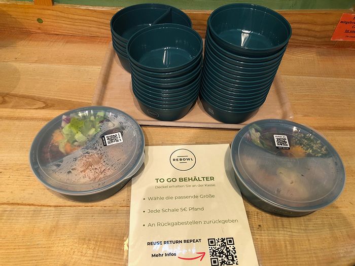 このお弁当箱のように仕切りのある入れ物は、街の中のさまざまな提携レストランやショップで使用、返却することができます。QRコードを見ればどこのお店が提携しているかわかるようになっているので使い方も簡単。最初に5ユーロ程度を容器代として支払ってデリを持ち帰り、食べて空にして返却するとお金が返ってくる。容器は丈夫なので返却せずそのまま使用し続けても問題ありません。もちろん素材もリサイクルやBPAフリーなど健康や環境に配慮されたものを使用しています。