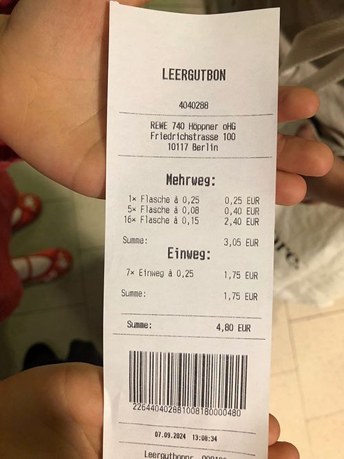 こんな風にレシートが出てきてレジでお金を受け取ります。今回は4.8ユーロ返ってきました。