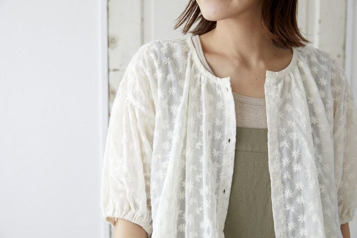 ほどよいシアー感のブラウスは、細かいお花の刺しゅうがたくさん施されることで上品な一枚に。