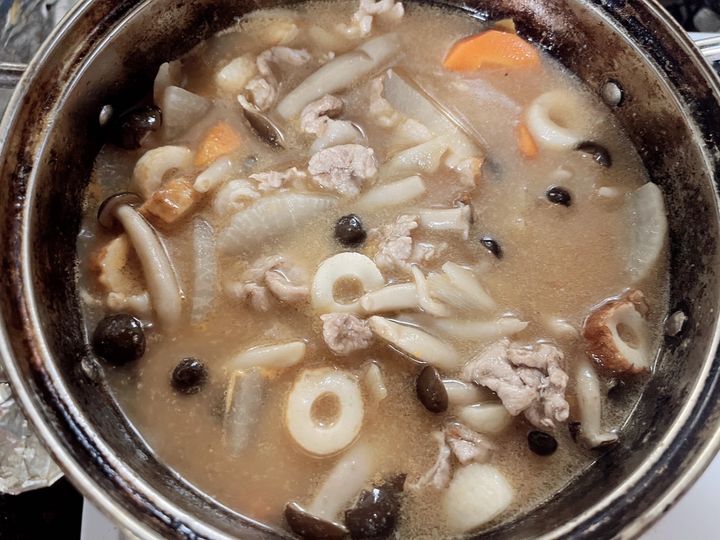 (3)水・和風だしの素を加え煮込み、アクをすくいながら野菜が柔らかくなるまで煮込む。