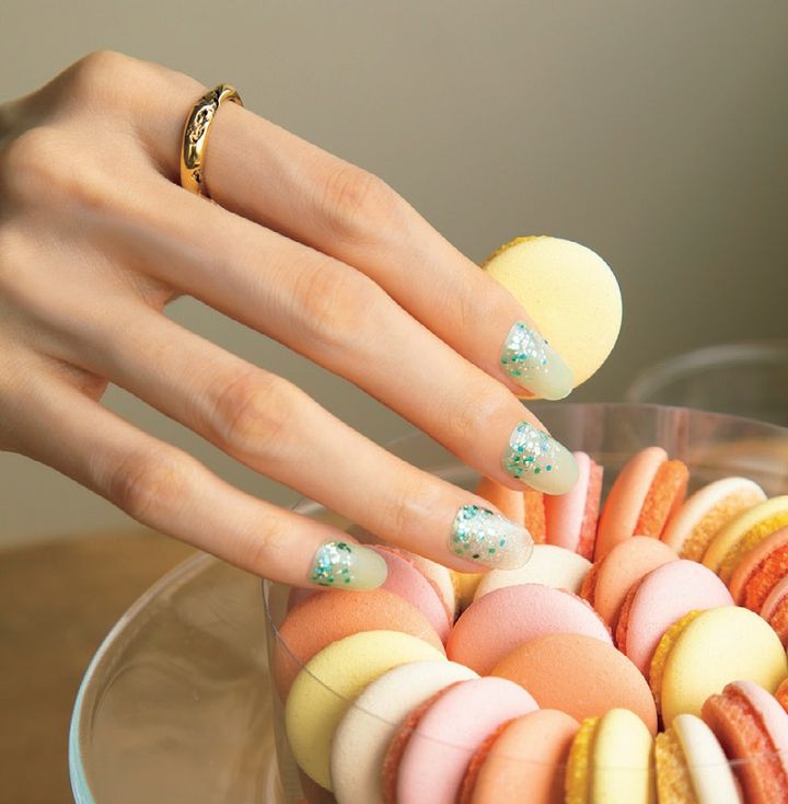 大人のお洒落は爪先まできちんとしていたい。人気のukaのネイリストが提案する、GLOW世代にマッチしつつセルフで手軽にできるネイルを紹介。今回はシアー&パーリーなグリーンをベースに、たっぷりのラメを散りばめたネイル。