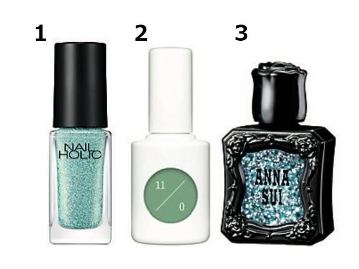 1.ネイルホリック オーロラグリッター GR762 396円〈編集部調べ〉(コーセーコスメニエンス) 2.uka カラーベースコート ゼロ 11/02200円(uka Tokyo head office) 3.ネイルカラー トッパー 910 2200円(アナ スイコスメティックス)