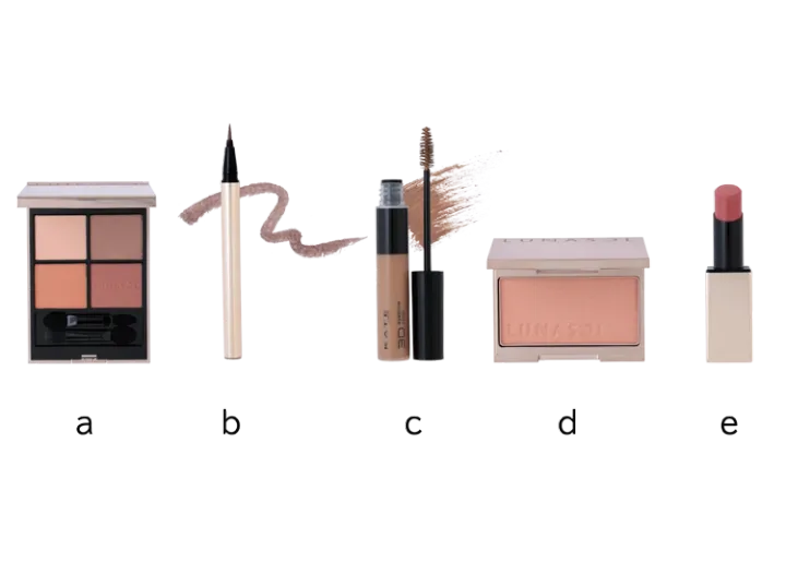 薄茶のbで上は黒目の範囲だけ、下は全体にアイラインを引く。眉はcを塗って目元の明るいベージュトーンにそろえる。