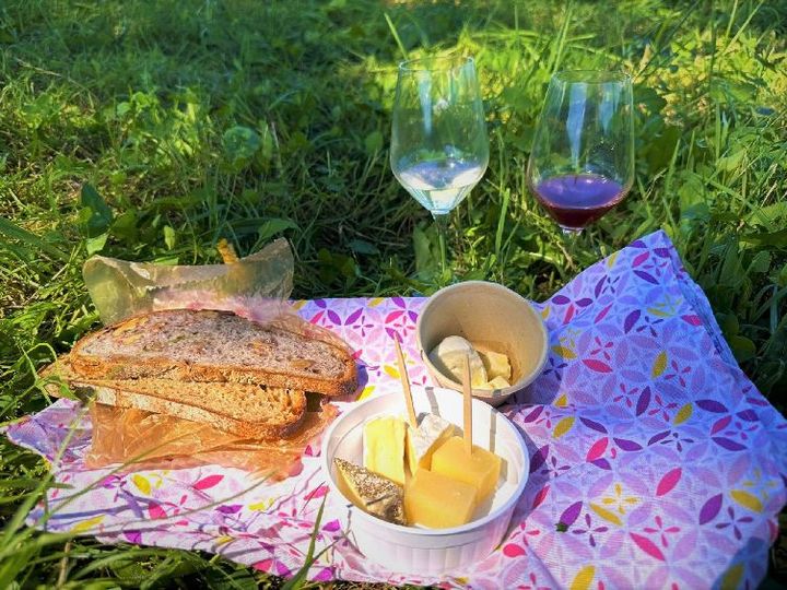 会場で購入したチーズ、パン、ワインでピクニック気分