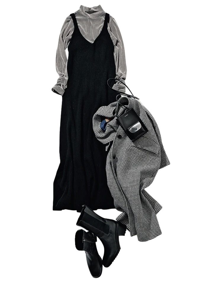 キャミワンピの下にグレーのタートルネックをIN。足元にはショートブーツ、コートもグレーで統一して、可愛いキャミワンピースをキレイなムードに転換。