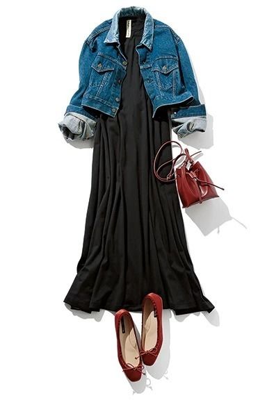 羽織りアイテムもカーディガンだとややコンサバ。ワンピ+Gジャンの定番スタイルも、Gジャンの丈を短めにすることで、腰の位置も上がって見えるスタイルUP効果に加え、ラフすぎない仕上がりに。デニムにも黒にも好相性な、深みのある赤の小物をセットしてバランスよく。