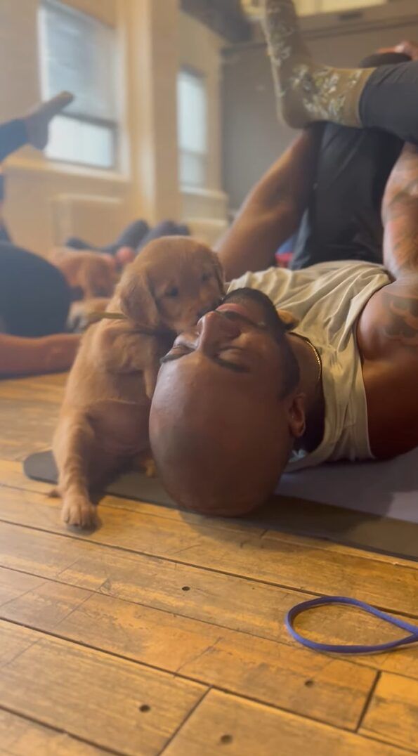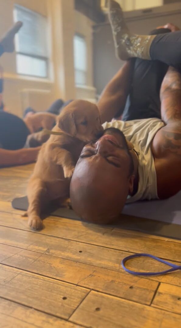 フロア内を自由に動き回っているゴールデンレトリバーたち。 そのうちの1匹、子犬のこの子はヨガをしている最中の男性のおヒゲが気になったようです。