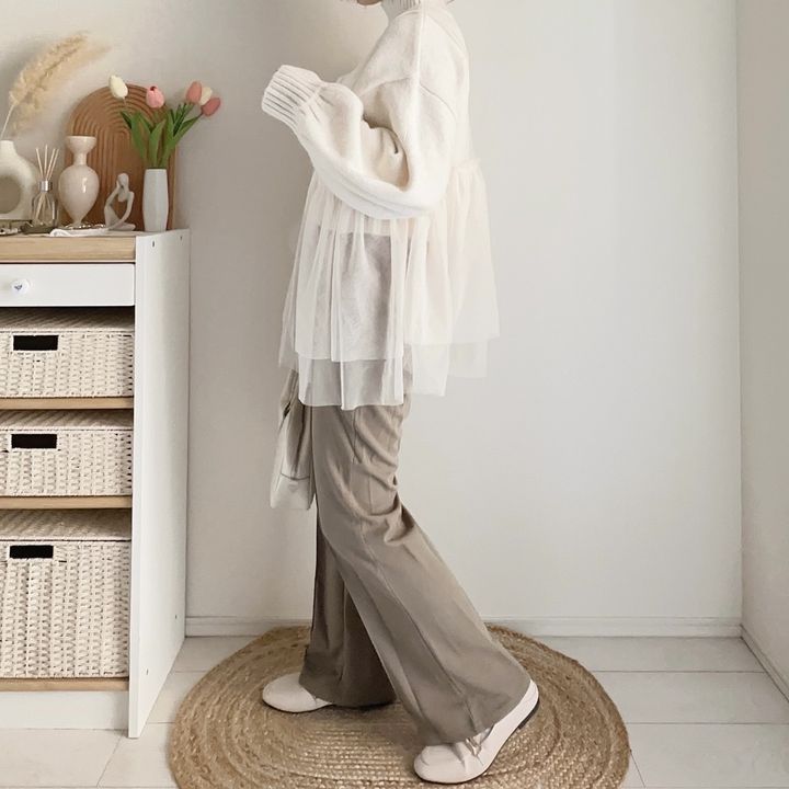 セットで着るとこんな感じ。 ニットだけでもかわいいですが、今年はチュールアイテムが旬なので、セットで着ていつもよりワンランク上のレイヤードコーデに。 コーディネートがマンネリ化して悩んでいる方におすすめです。