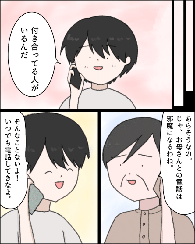 遠くで暮らす息子と毎日電話で話すことを心のよりどころにしていたある日、息子から「付き合ってる人がいるんだ。」と打ち明けられました。息子には平常心を装い「あらそうなの。じゃ、お母さんとの電話は邪魔になるわね。」と言うと、優しい息子は「そんなことないよ!いつでも電話してきなよ。」と言ってくれました。