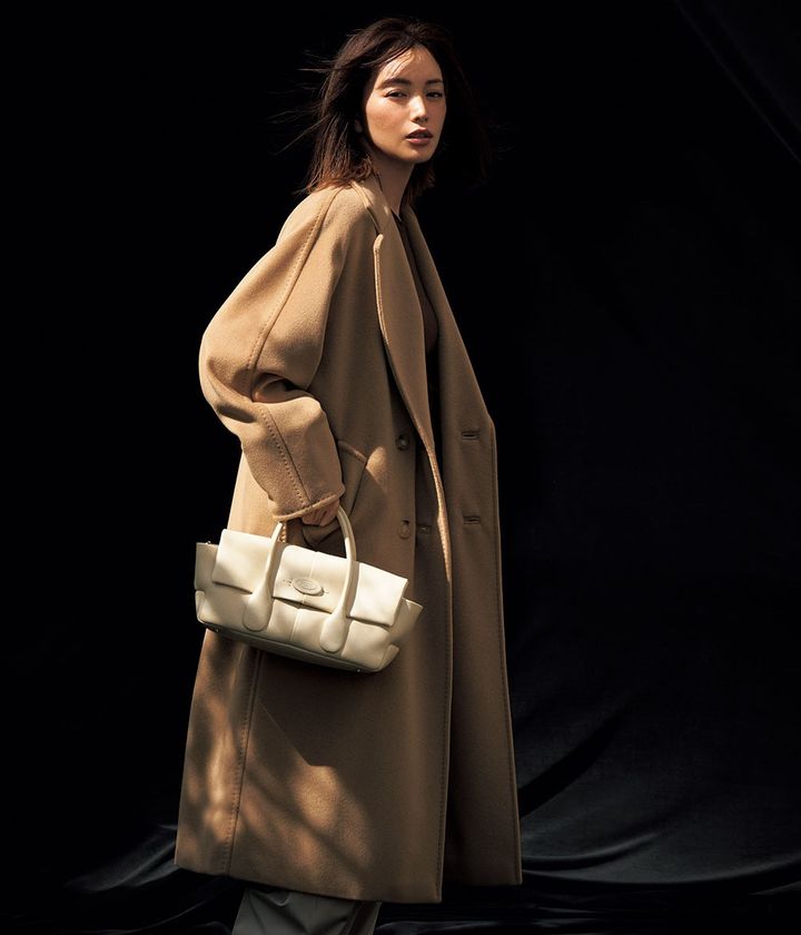 蛯原友里さんも羽織った瞬間の高揚感が忘れられず購入を決意したというMax Mara(マックスマーラ)のコートは言わずと知れた名品。纏うだけでいつものコーディネートもたちまちエレガントな表情に。旬な横長バッグのまろやかな白がキャメルにやさしく映えます。