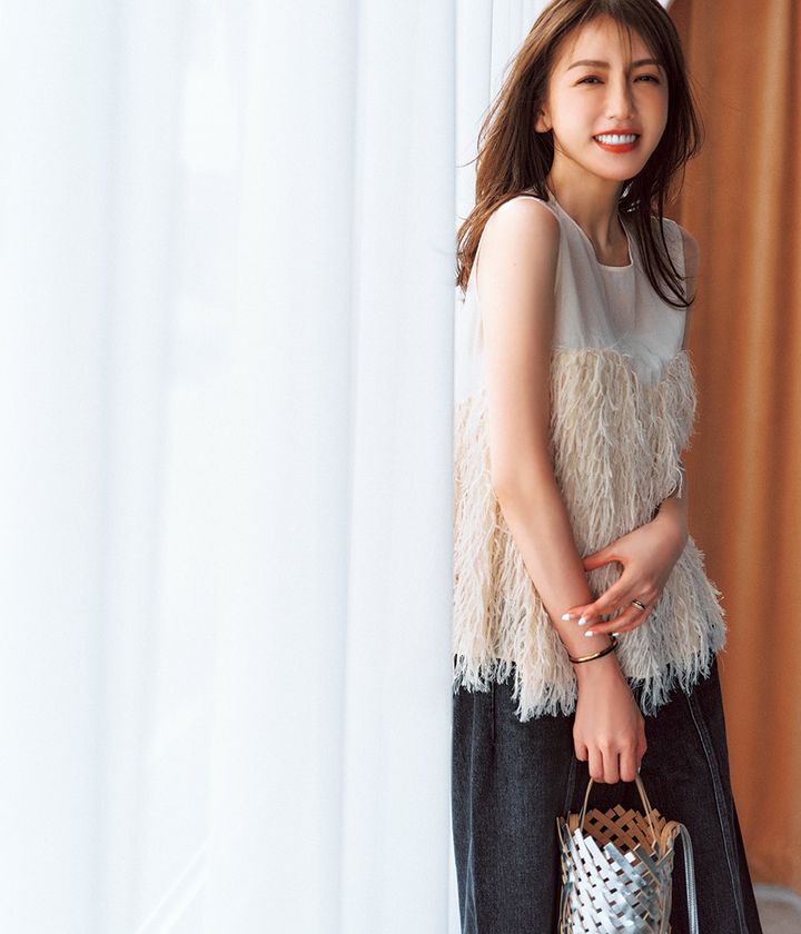 毛足の長いフリンジがフェザーのようにリッチなブラウスでデニムコーデを秋らしく更新。ふわふわとした質感がジュエリーの硬質な煌めきをよりいっそう引き立ててくれます。暑さの残る時季は素材感で季節を先取り。