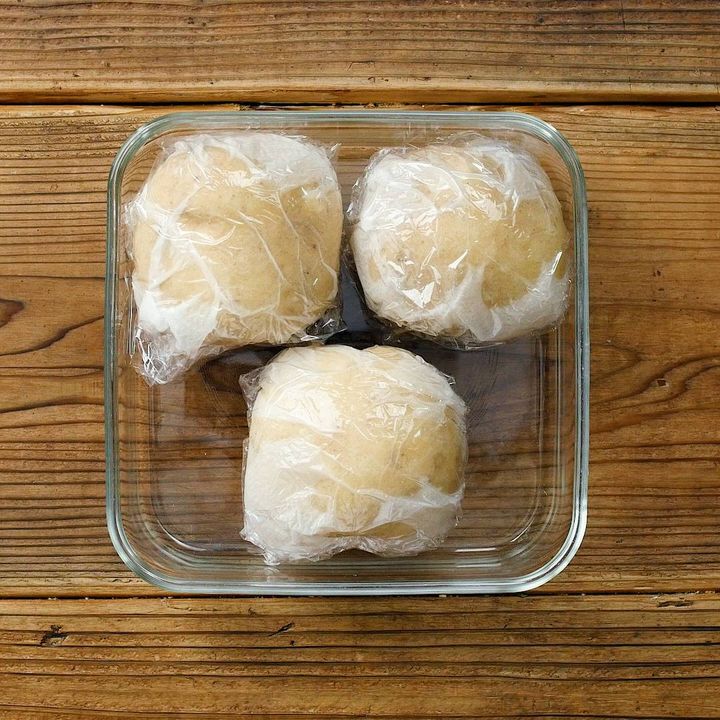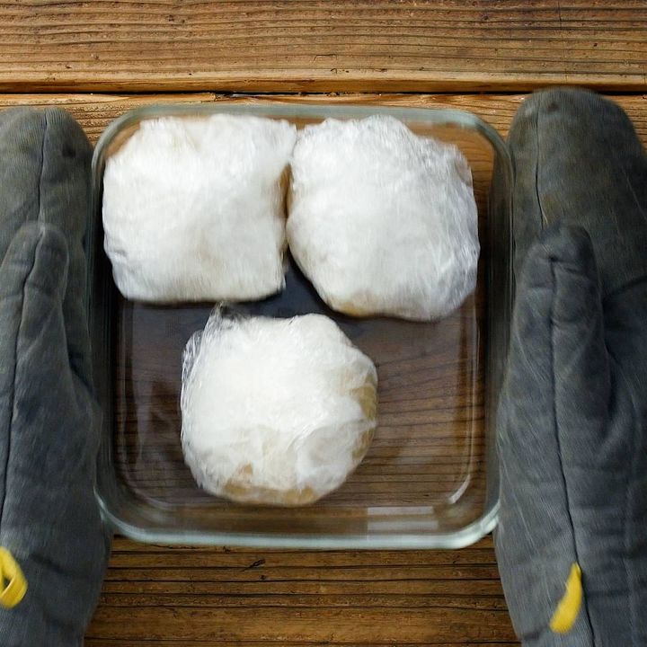 1: じゃがいもは洗った後ぬれたままクッキングペーパーで包み、ラップでふんわり包んで、レンジ600Wで3分加熱します。