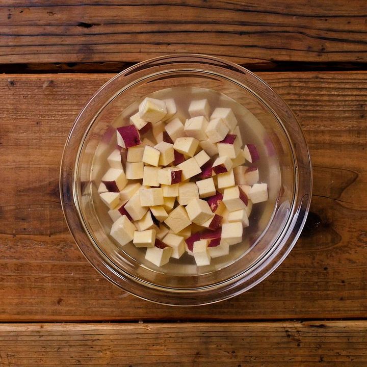 1: ボウルにさつまいもを入れ、5分ほど水にさらして水気を切ります。