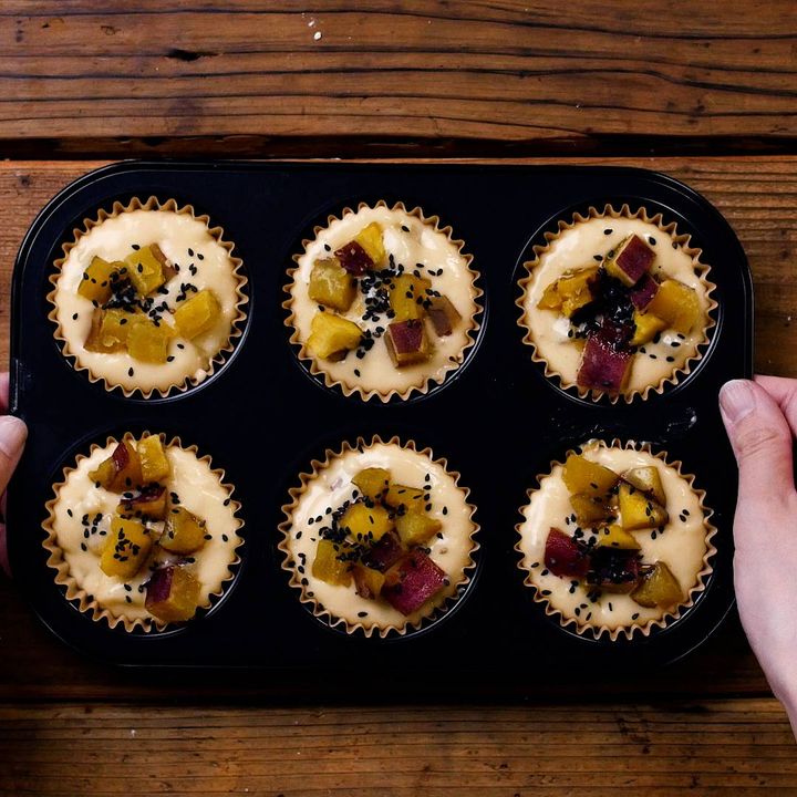 10: カップを入れたマフィン型に流し入れ、残りの③、黒いりごまをのせます。