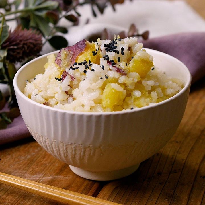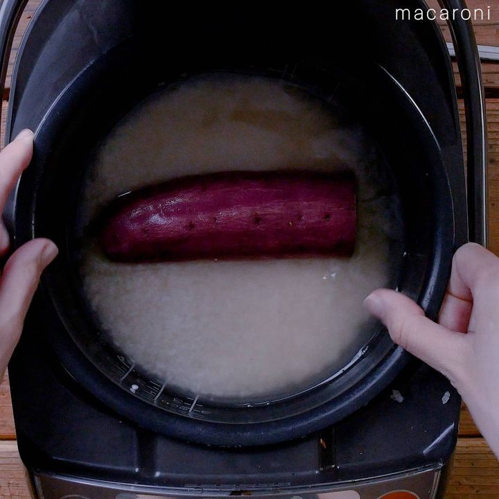 2: さつまいもをのせて炊き込みごはんモードで炊飯します。