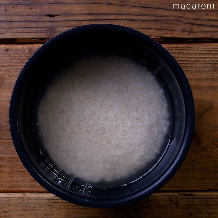 1: 炊飯釜に米、白だし、みりんを入れて水を2合目の目盛りまで入れて混ぜ合わせます。