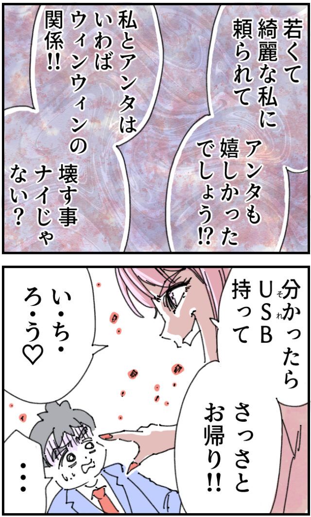 「若くて綺麗な私に頼られてアンタも嬉しかったでしょう?私とアンタはいわばウィンウィンの関係!!壊す事ナイじゃない?」白石さんは、自分が頼ることでいちろうさんも嬉しかったはずだと言い「分かったらそれ持ってさっさとお帰り!!い・ち・ろ・う」と言って笑います。いちろうさんは白石さんのとんでもない本性を知り驚きのあまり言葉も出ません。