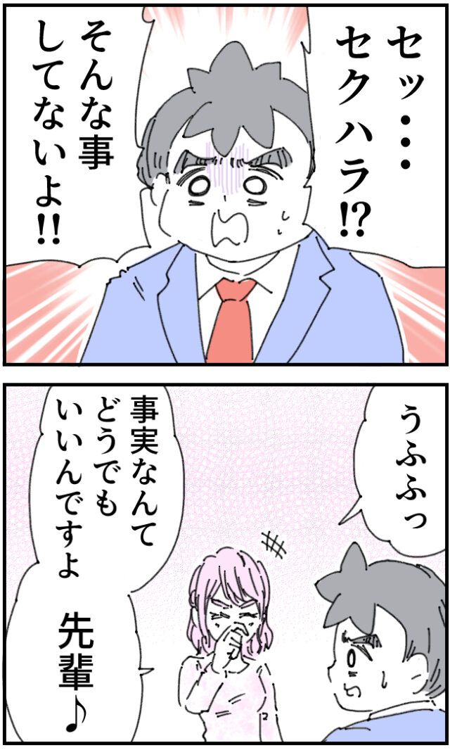 「セ、セクハラ!?そんな事してないよ!!」全く身に覚えのないいちろうさんは驚いて否定しますが、「うふふっ。事実なんてどうでもいいんですよ、先輩」と笑い飛ばす白石さん。