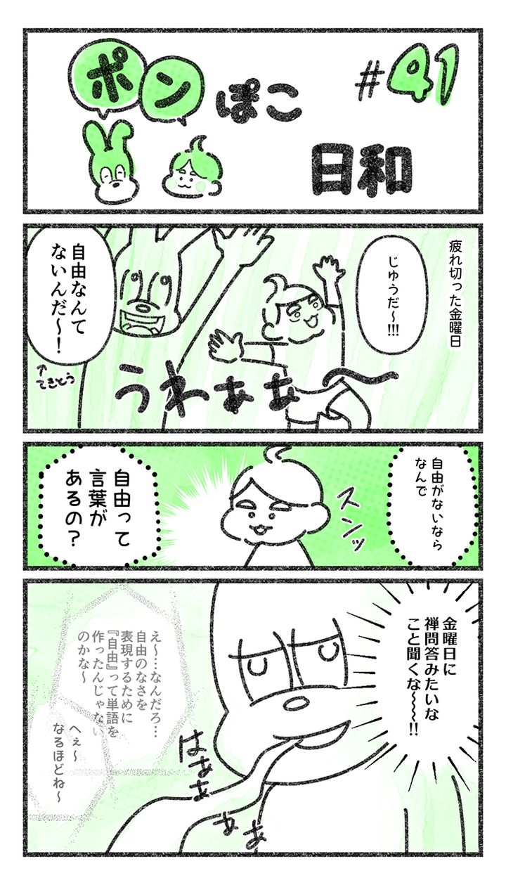「じゆうだ~!」とはしゃいでいたので、適当に「自由なんてないんだ~!」と叫んだら、急にスンッとなって「自由がないならなんで自由って言葉があるの?」と禅問答ばりの問いを返されてしまい、白目を剥きました(笑)。