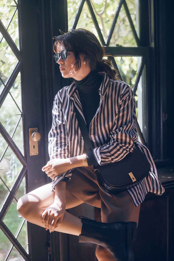 微光沢なコットン素材と白×ブラウンのストライプが大人顔なボタンダウン。トレンドのショートボトムスをクラシカルに転ばせる、スタイリッシュなバランス。シャツ¥28,600ニット¥20,900バッグ¥97,900(すべてポロ ラルフ ローレン/ラルフ ローレン)ショートパンツ¥15,950(アンクレイヴ スタンダード/アンクレイヴ)ブーツ¥161,700(セルジオ ロッシ/セルジオ ロッシ カスタマーサービス)サングラス¥44,000(アイヴァン/アイヴァン 東京ギャラリー)イヤリング¥7,560バングル¥5,400(ともにアビステ)