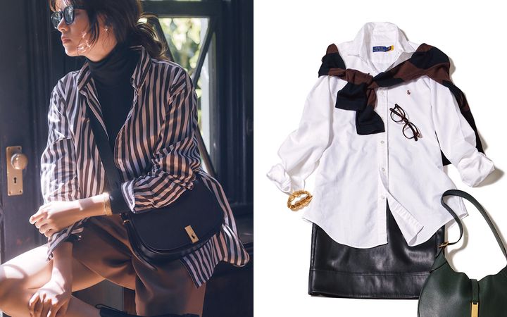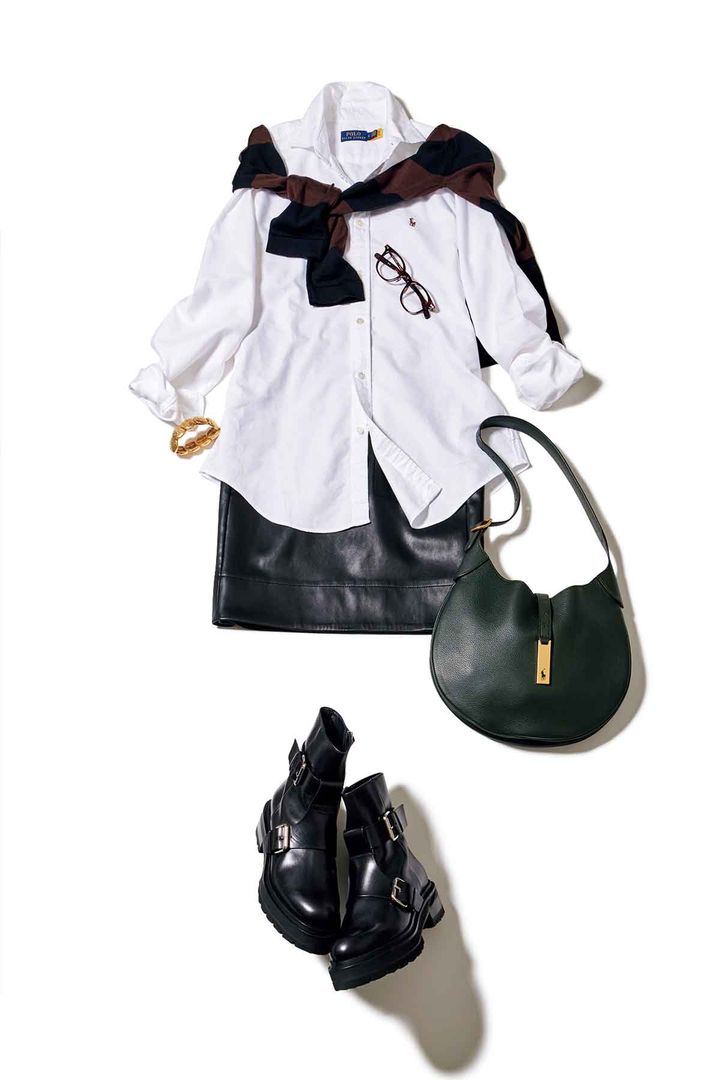 チョイスしたのはボタンダウンじゃないオックスフォードシャツ。レザー調のミニスカでパンチを効かせれば、更新されたトラッドに仕上がります。シャツ¥22,000バッグ¥93,500(ともにポロ ラルフ ローレン/ラルフ ローレン)肩にかけたニット¥39,600(ジョン スメドレー/リーミルズ エージェンシー)スカート¥18,700(MACPHEE/TOMORROWLAND)ブーツ¥201,300(ピエール アルディ/ピエール アルディ 東京)メガネ¥51,700(アイヴァン 7285/アイヴァン 7285 トウキョウ)バングル¥23,100(アビステ)