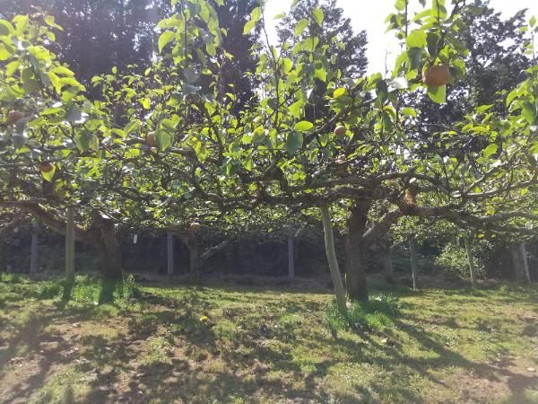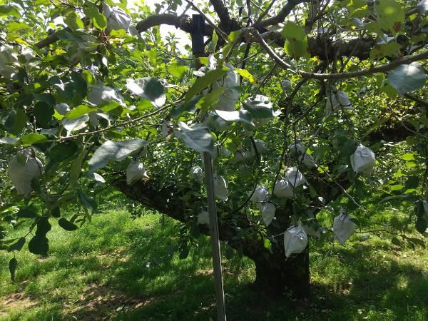 りんごの木の少し上には梨の木もあります。こちらも採っていいですよということでした。栽培しているけれど、カメムシの被害で出荷は難しいのだとか。「豊水」をいただきましたが、木が育てたものをその場で食べるからか水分たっぷりで美味しい。