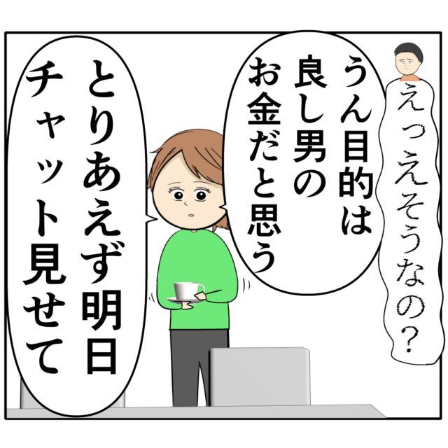 すみれさんの言葉に「えっそうなの?」と驚く良し男さん。すみれさんは冷静に話を続けます。「うん、目的は良し男のお金だと思う。とりあえず明日チャット見せて」