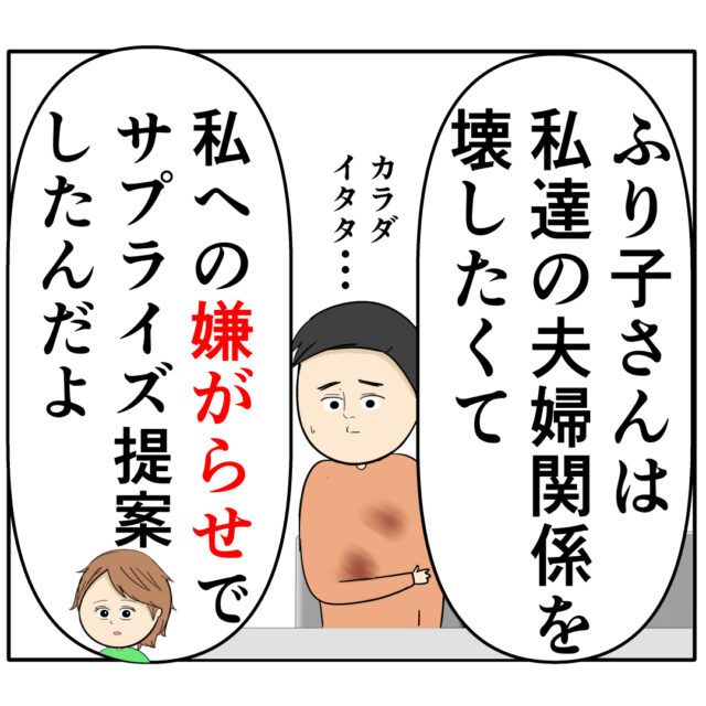 そして、「ふり子さんは私達の夫婦関係を壊したくて私への嫌がらせでサプライズ提案したんだよ」と、良し男さんがすみれさんのためだと思って仕掛けたサプライズは、ふり子さんが仕組んだすみれさんへの嫌がらせだったことを説明します。
