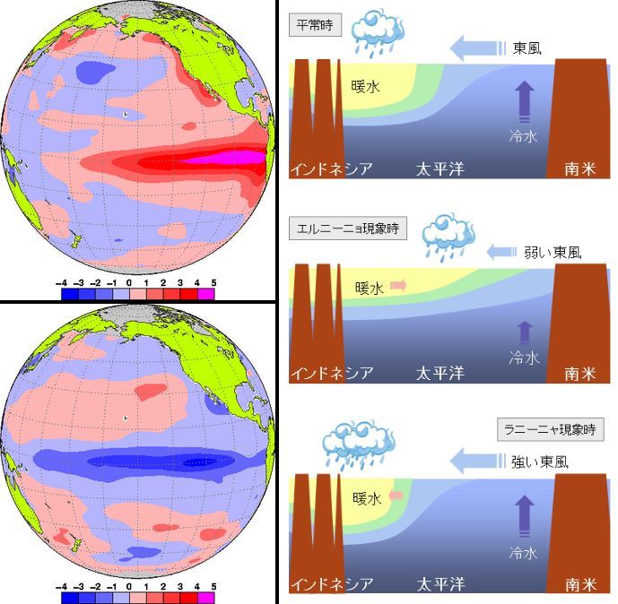逆に低い状態が続くことをラニーニャと呼び、この2つの現象はそれぞれ数年おきに発生します。