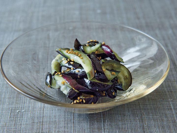 箸休めになるあえものも、たて塩なすがあればすぐできます。たて塩なす2個分を斜め薄切りにし、水けを絞ります。ボールに入れ、ごま油、白いりごま各小さじ1を加えてさっとあえれば完成です。