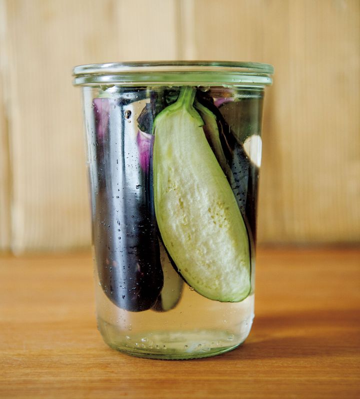 (2)保存容器になすを入れ、塩水を注ぎ、冷蔵庫で半日ほど置く。