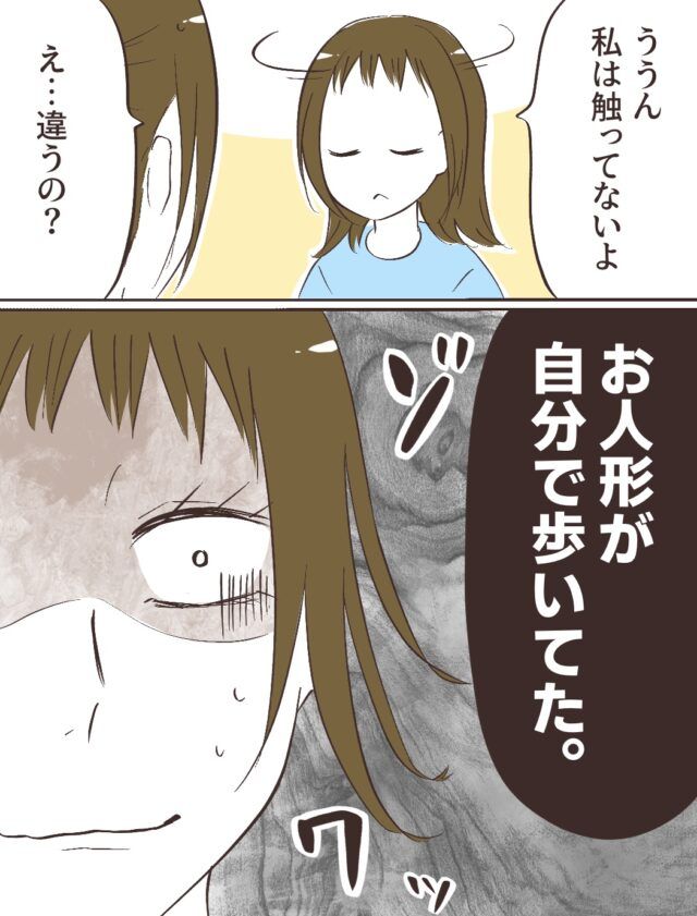すると「ううん。私は触ってないよ」と首を横に振るリコちゃん。「え・・違うの?」と驚くママに聞かれて「お人形が自分で歩いてた」と言いました。リコちゃんの言葉を聞いて、またしてもゾワっと寒気がしたママ。