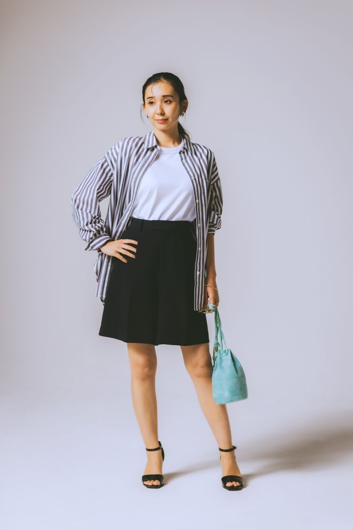 体が中で泳ぐぐらいのオーバーサイズシャツは、夏は羽織りとしても使えて体型カバーも叶う万能アイテム。無地よりも、ストライプやギンガムチェックなど、柄があるアイテムが、コーディネートのアクセントになって着回せます。シャツ¥1,990(GU)
