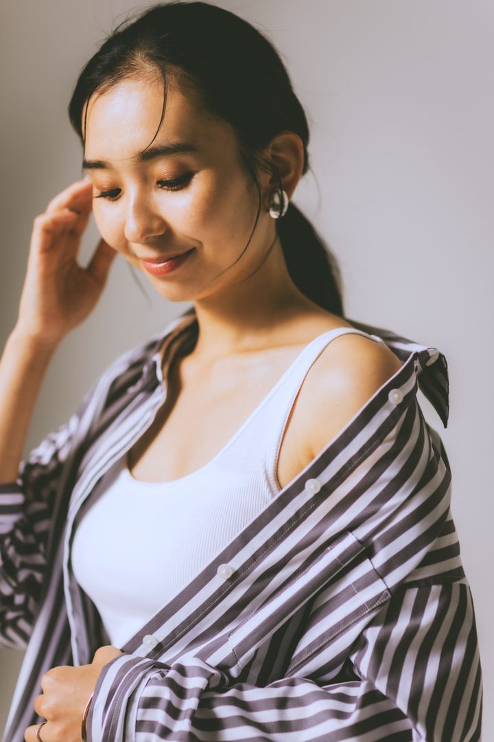 「オーバーサイズシャツはメンズライクなアイテムなので、さりげなく女らしい要素を足すのが正解。デコルテをほどよく肌見せすれば、女っぽさとともに、デコルテに抜け感が出て小顔効果も期待できます。ただ、肌見せはさりげなさが大事。谷間が見えるほど空きの深いタンクトップはいやらしく見えてしまうので注意して」(スタイリスト・児嶋里美さん)