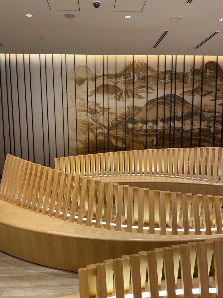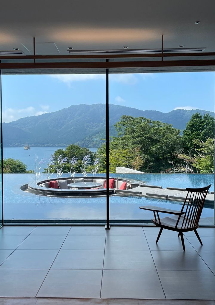 晴れた日はソファーの周りにはった水面と芦ノ湖が続いているように見えて、とっても素敵でした✨