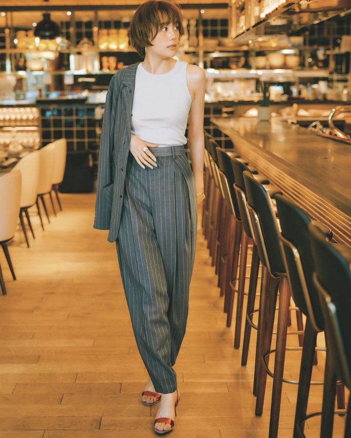 ビジネスシーンで活躍するジャケパンコーデは、あえて休日ムードに着崩して普段と違うあか抜けを。カジュアルの大本命「アメスリタンクトップ」をインナーに仕込みつつジャケットを肩がけすれば、ほどよい肌見せも叶い肩肘張らない印象に。足元はレディなサンダルで、大人っぽく引き締めるのが正解です。
