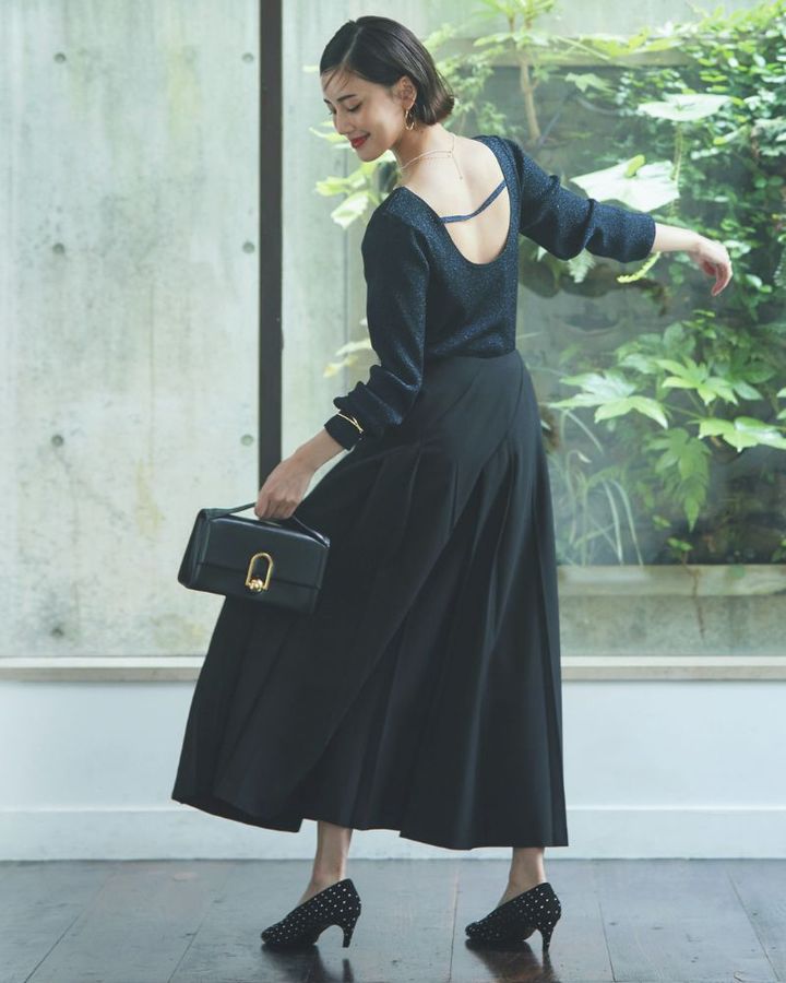 退勤後にそのままディナーデートの日は、オフィスで浮かないドレスアップが肝。ドラマティックなフレアスカートや背中あきのラメトップスも、全体をダークカラーでまとめるだけで知的な印象に。キレイめムード漂うレザーバッグやヒールを投入してリッチに仕上げて。
