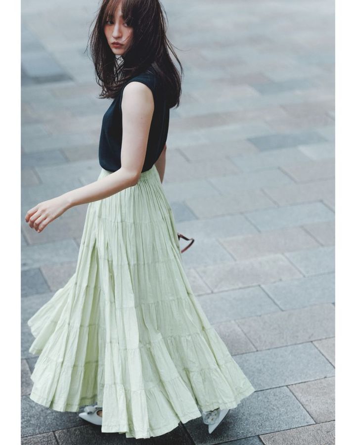 トップス¥9,900(quaranciel/シップス インフォメーションセンター)スカート¥52,800(ソブ/フィルム)ピアス¥22,000(Jouete)パールネックレス¥40,700ネックレス¥113,300(ともにマリハ)リング¥40,700(リューク)バングル¥7,700(アビステ)バッグ¥82,500(マエストソ/アマン)パンプス¥192,500(セルジオ ロッシ/セルジオ ロッシ カスタマーサービス)