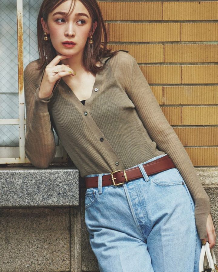 寒暖差の激しいこの時季はシアーニットに頼ると、温度調整を叶えつつ旬のムードが加わります。ニュアンスカラーなら、透け素材でもいやらしくなく好印象。トップスでヘルシーな女性らしさをアピールしつつ、ボトムスはヴィンテージライクなデニムで狙いすぎず好バランスに。