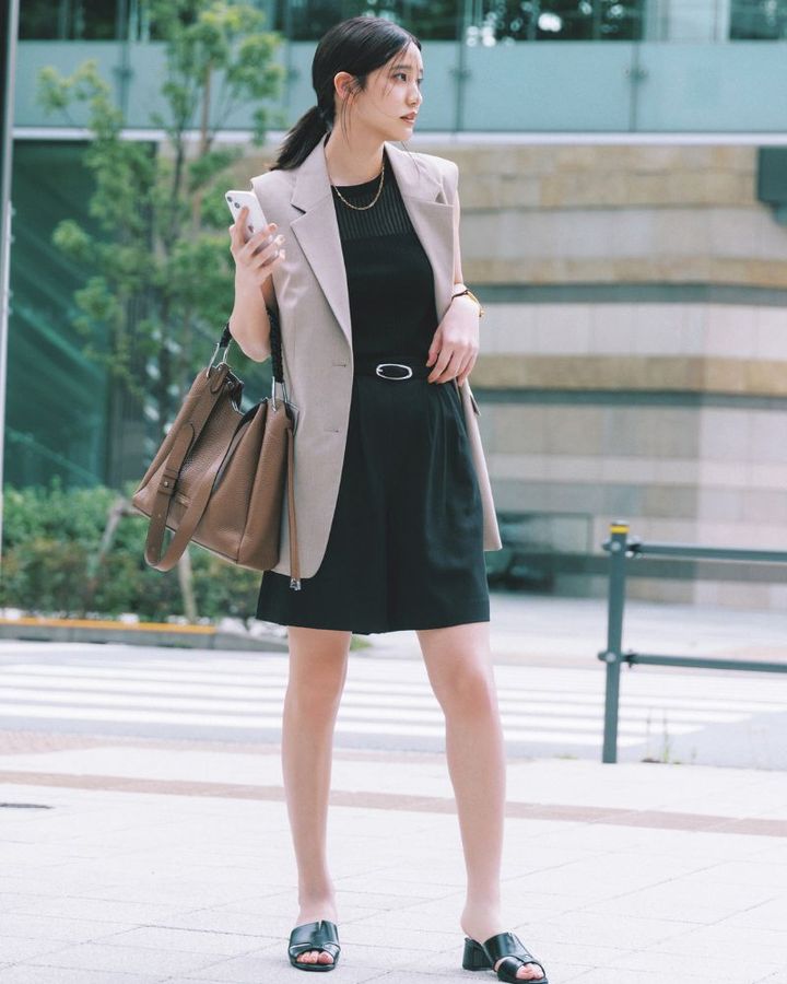 休日ムード漂う「ショートパンツ」を通勤で着こなすなら、知的に見える黒一択。さらにトップスのニットとワントーンにすることで、Iラインが協調されて悪目立ちしません。サラッとジレを羽織ったりレザー小物を散りばめたひと手間で、グッと仕事モードに引き締めを。
