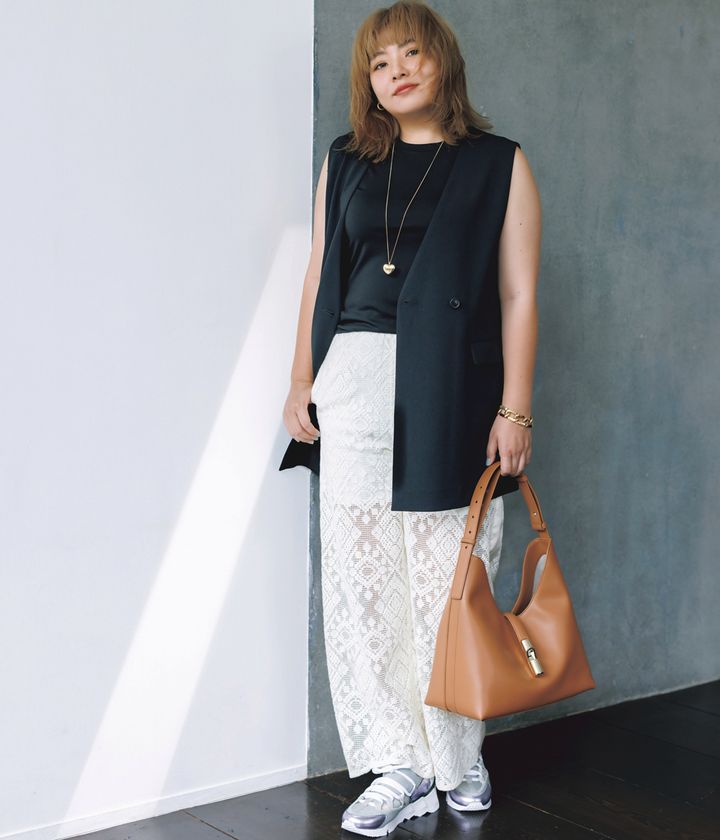 ジレ¥9,990(アンフィーロ)タンクトップ¥5,390(エルーラ/アダストリア)パンツ¥29,700(アダム エ ロペ)バッグ¥58,300(フルラ/フルラ ジャパン)スニーカー¥111,100(ピエール アルディ/ピエール アルディ 東京)ピアス¥77,000(ウノアエレ/ウノアエレ ジャパン)ネックレス¥9,020(ピルグリム/ZUTTOHOLIC)ブレスレット¥37,800(アビステ)